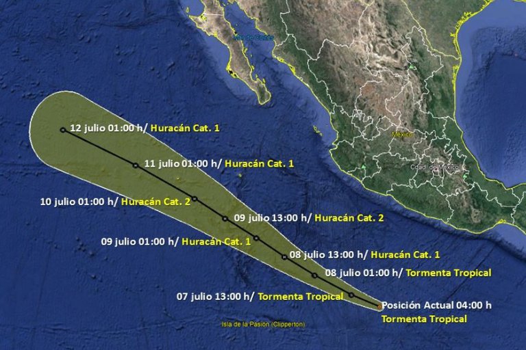 El SMN advirtió que el meteoro ocasionará lluvias intensas en Colima y Jalisco, muy fuertes en Michoacán y Nayarit, y fuertes en Baja California Sur, así como rachas de viento de 50 a 60 km/h en el golfo de California, además de oleaje de 2 a 3 metros en las costas del sur y suroeste.