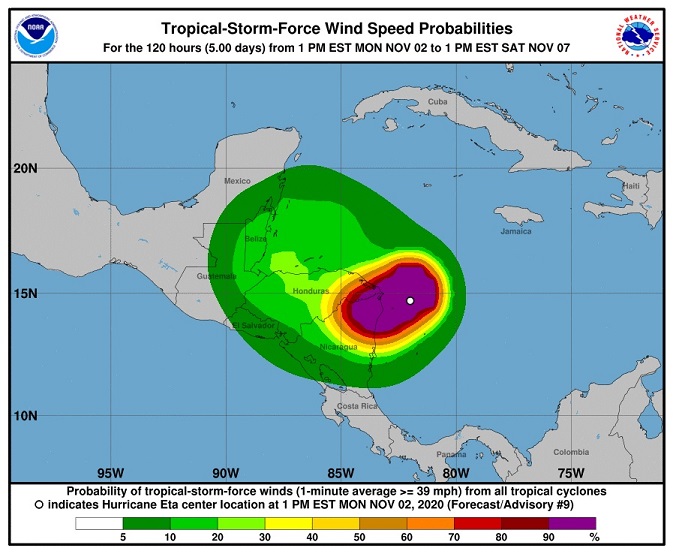 El Sistema Nacional para la Prevención, Mitigación y Atención de Desastres (Sinapred) indicó que el vigesimonoveno organismo tropical de la temporada se localizaba a 120 kilómetros al sureste del Cabo de Gracias a Dios, con vientos sostenidos de 212 kilómetros por hora.